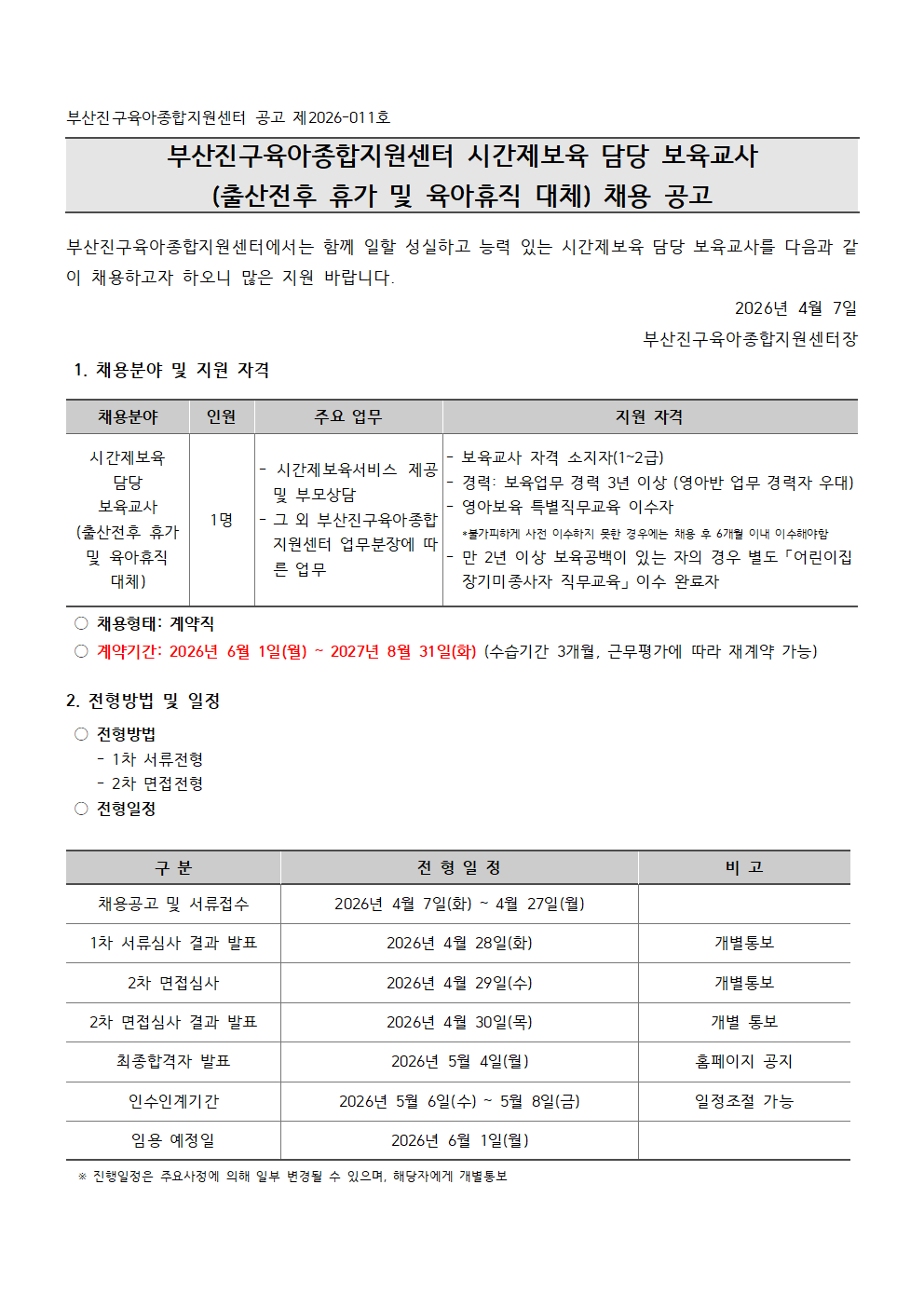 [부산진구육아종합지원센터] 시간제보육 담당 보육교사 및 출산전후 휴가 및 육아휴직 대체 채용 공고