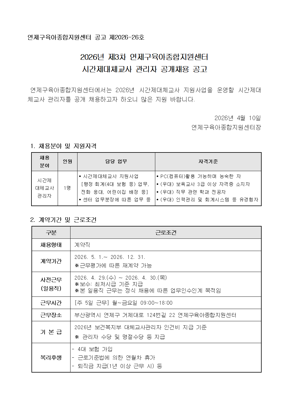 [연제구육아종합지원센터] 2026년 제3차 연제구육아종합지원센터 시간제대체교사 관리자 공개채용 공고