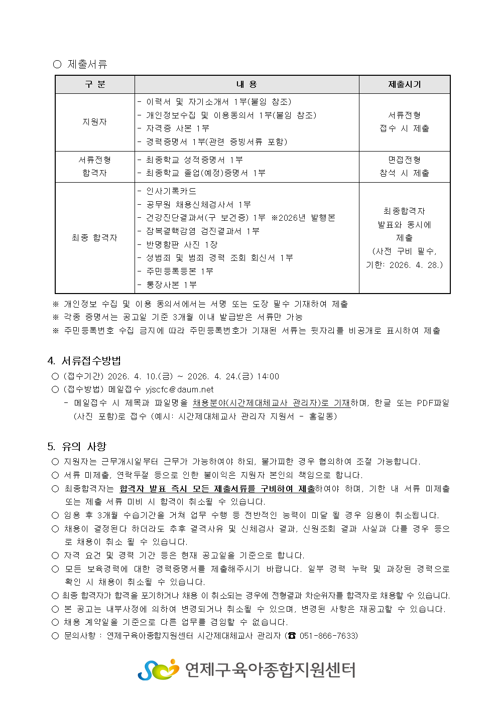 붙임1_연제구육아종합지원센터 제3차 시간제대체교사 관리자 공개채용 공고문 1부.hwp