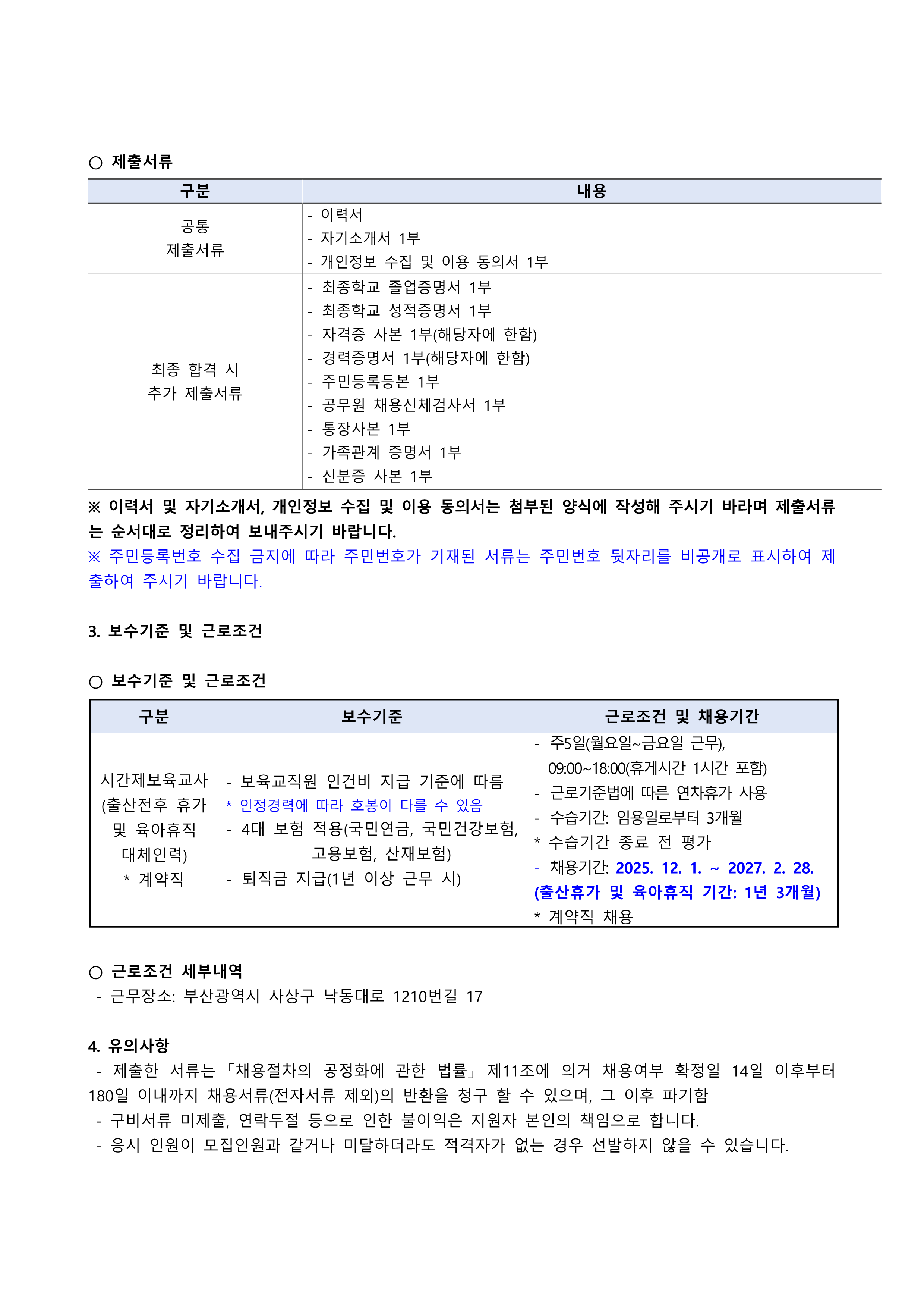[사상구육아종합지원센터]시간제보육교사(출산전후 휴가 및 육아휴직 대체인력) 채용 공고