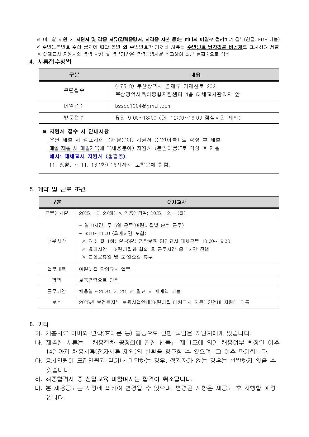 [부산광역육아종합지원센터] 대체교사 채용 공고