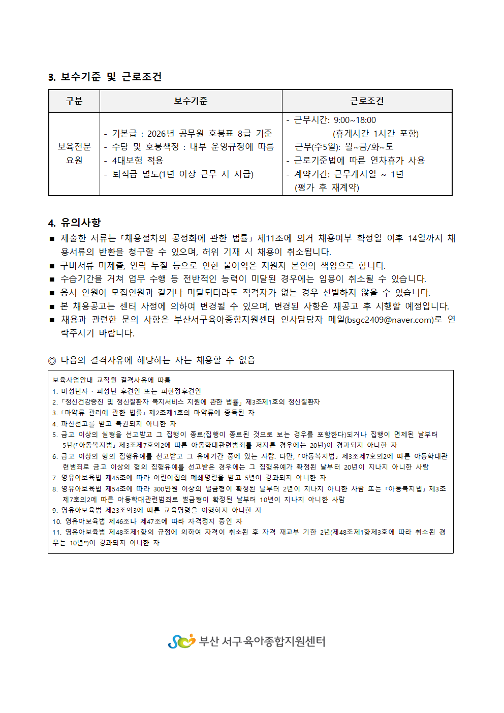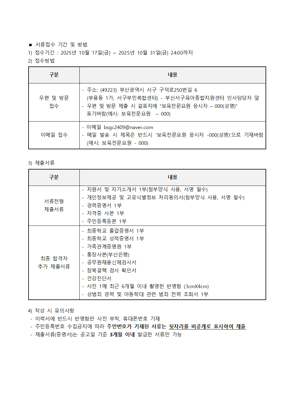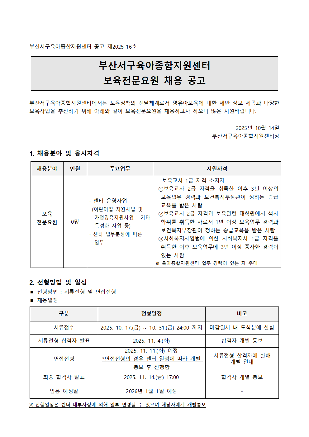 [사하구육아종합지원센터] 직원(상담전문요원, 특수교사) 채용 공고