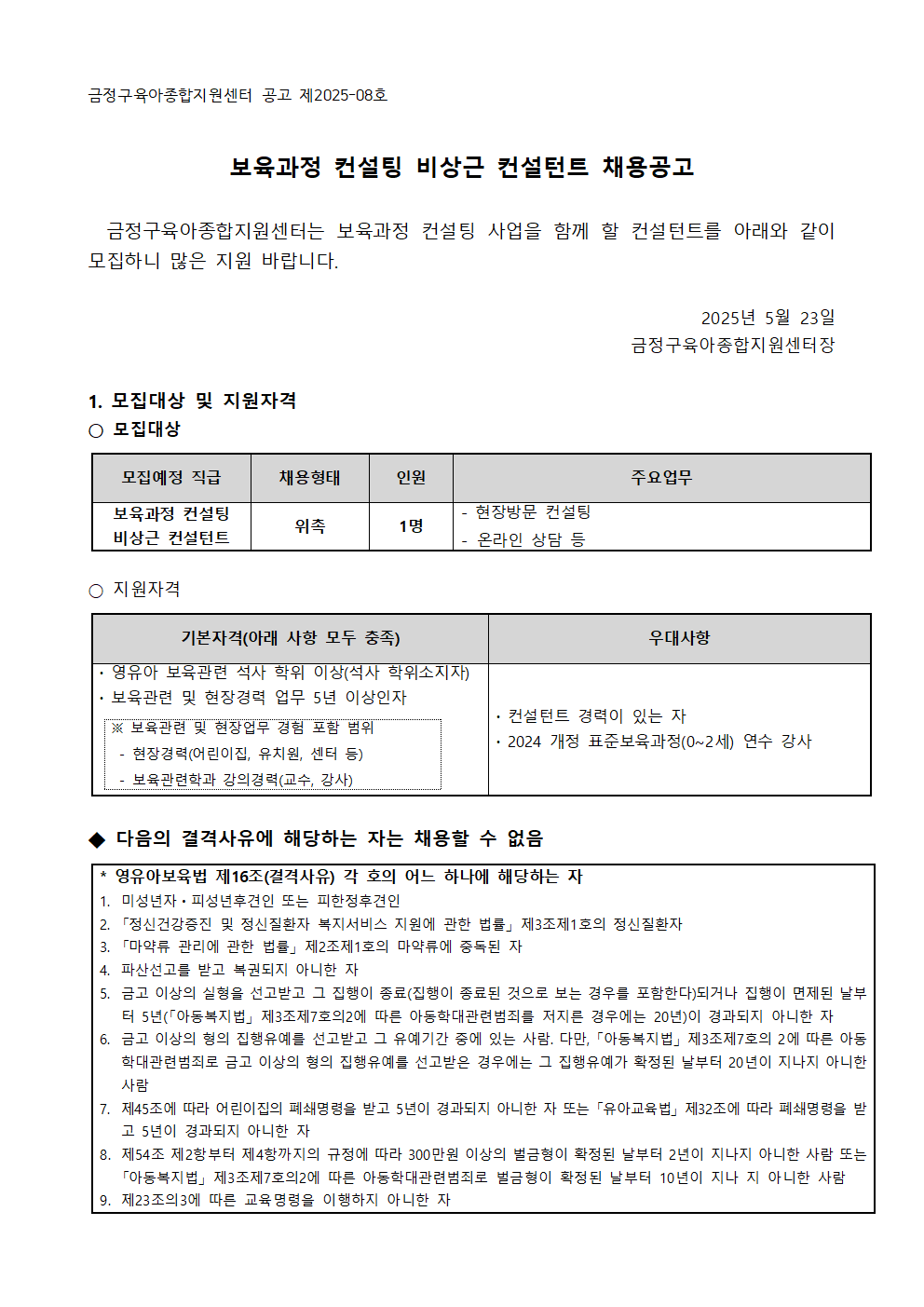 [금정구육아종합지원센터] 보육과정 컨설팅 비상근 컨설턴트 채용공고