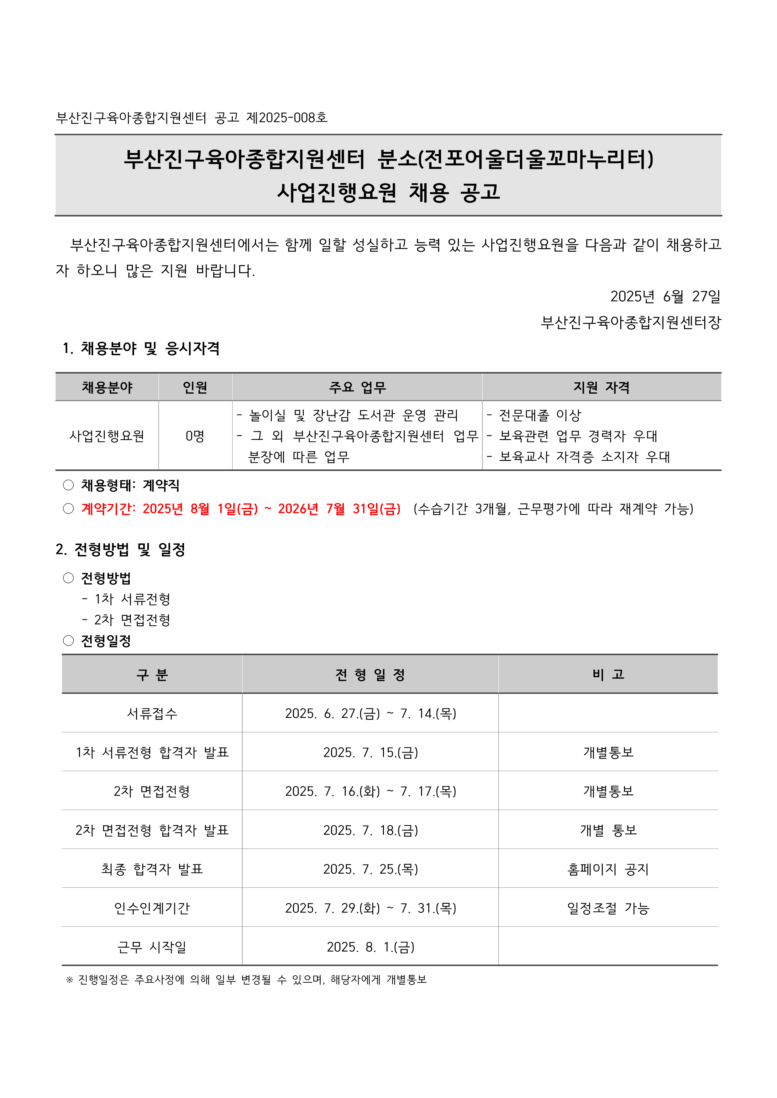 [금정구육아종합지원센터] 운영요원(육아휴직 대체) 채용공고